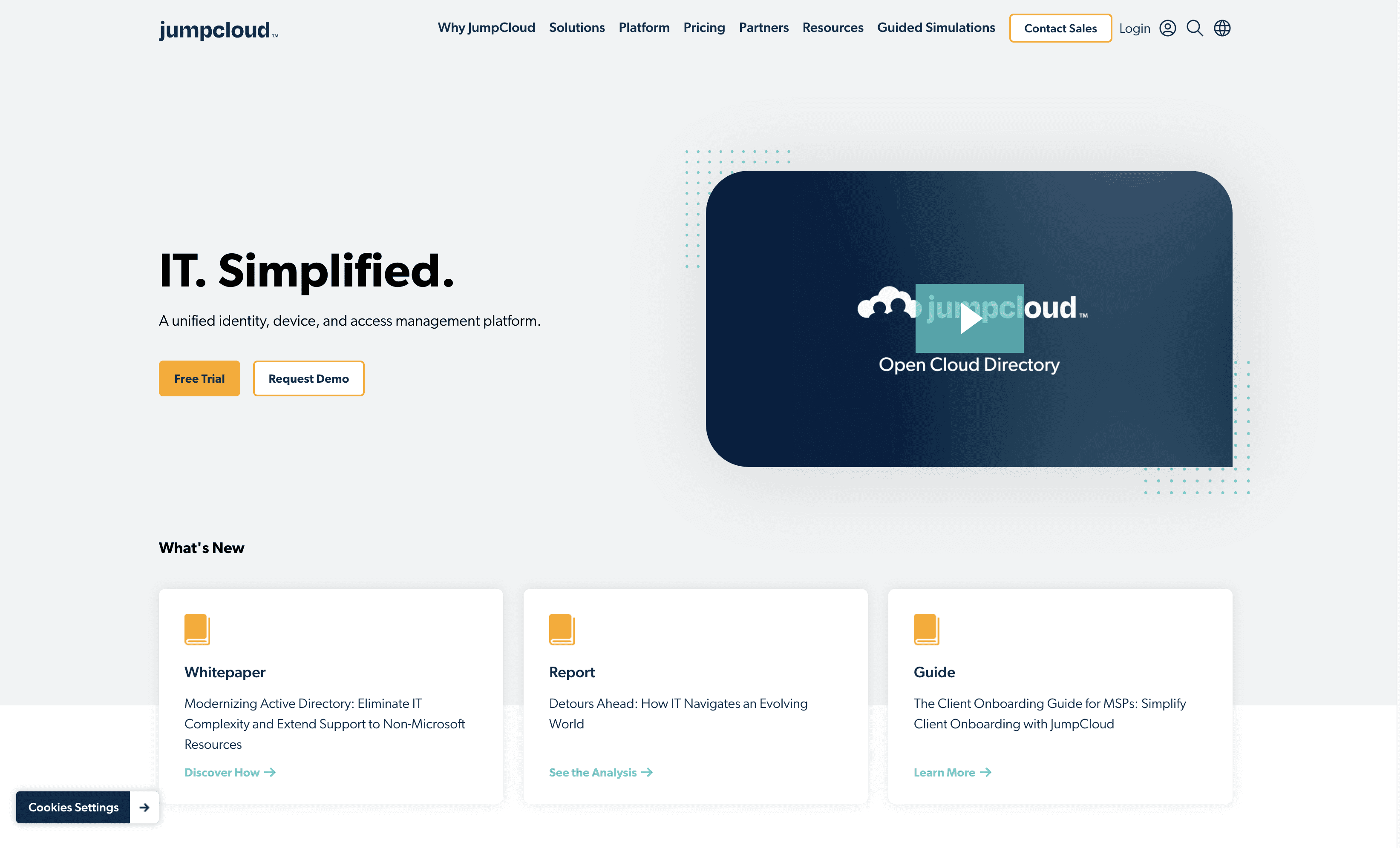 JumpCloud is a unified identity, device, and access management platform designed to simplify IT operations. It offers secure, frictionless access for users and integrates seamlessly with existing systems. With features like cloud directory, SSO, and device management, JumpCloud aims to enhance security and efficiency for businesses of all sizes.