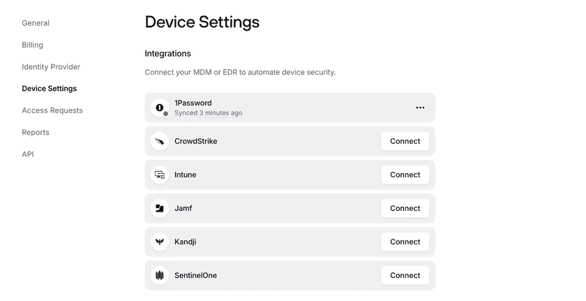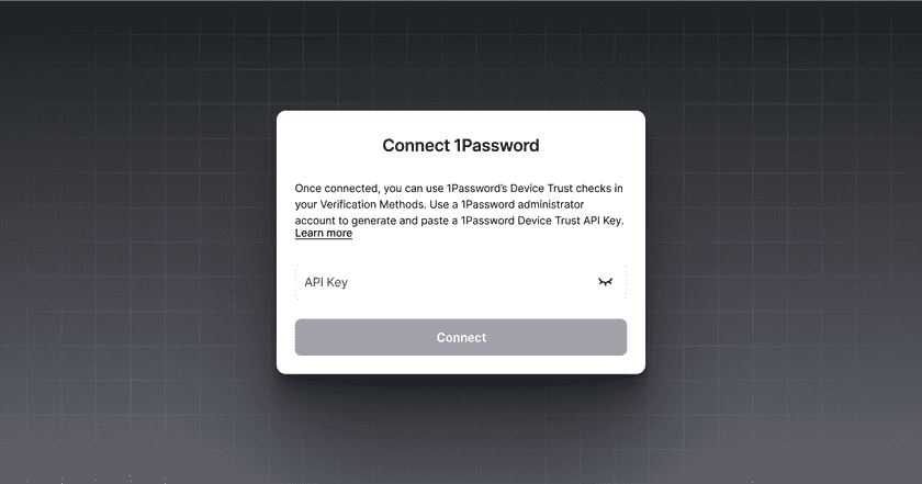 - Select Connect next to 1Password and input your 1Password Device Trust API Key