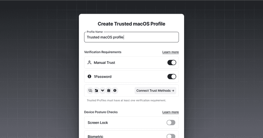 For macOS, Windows, and Linux, create a Trusted Profile and require 1Password Device Trust as a Trust Method. Only devices verified by 1Password Device Trust will satisfy the requirements of this Trusted Profile. This Trusted Profile can now be incorporated into Security Policies.