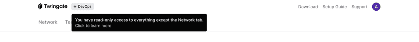 DevOps, Support, and Access Reviewer admins accessing the Admin Console will see their role reflected in a badge next to the Twingate logo. Additional information regarding their level of access is available by hovering over the role badge.