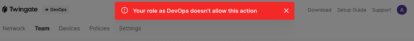 Twingate supports four admin roles, each of which has different levels of access to the Twingate Admin Console: