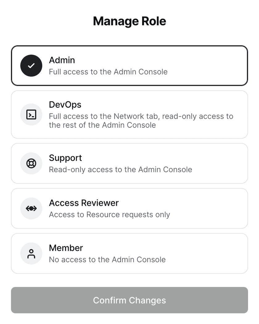 | DevOps | Network tab only, including the following: Creating and editing Resources, Connectors, and Remote Networks; Adding Groups to a Resource; Managing Request Access | Entire Admin Console |