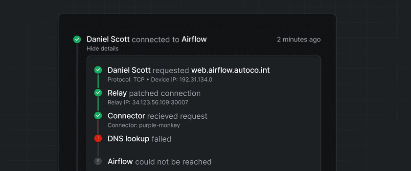 Twingate logs all network connections that are made between Clients and Connectors. These logs are:
