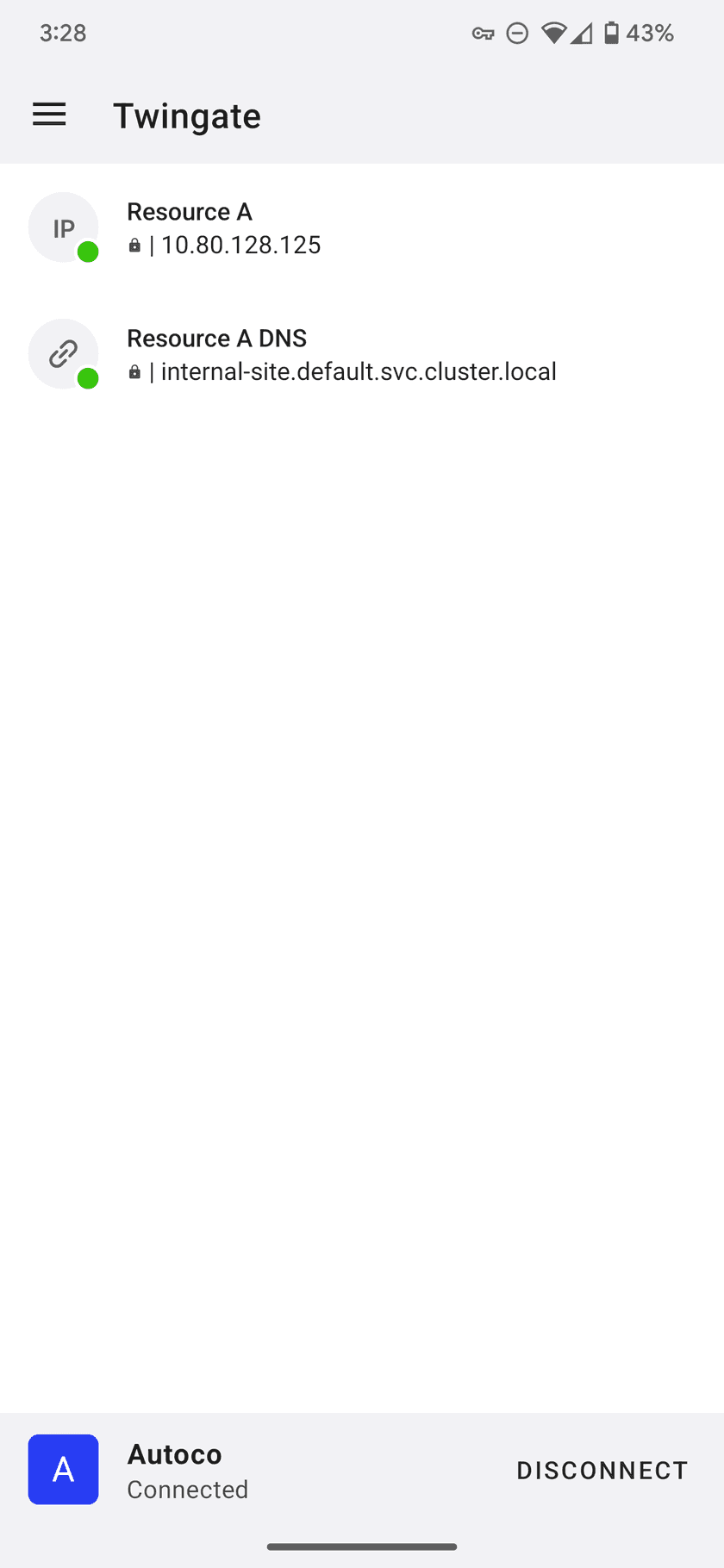 At this point you can close the Twingate app and leave it connected. It will not affect your regular internet browsing and only intercept network traffic for private Resources.