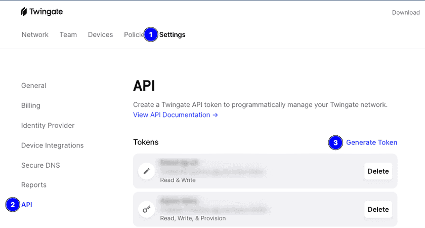 In order to access the GraphQL endpoint for your Twingate network, you first need to generate an API token in the Admin console. To generate an API token, log into the Admin Console and navigate to Settings > API > Generate Token as seen in the screenshot below.