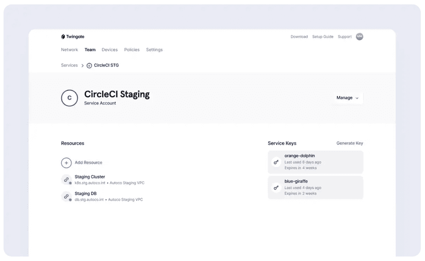 Service accounts are a first-class citizen in Twingate’s existing Zero Trust architecture, so you can easily assign access to existing resources—or define new ones—in your Twingate admin console, giving you a single view of access across your network and organization.