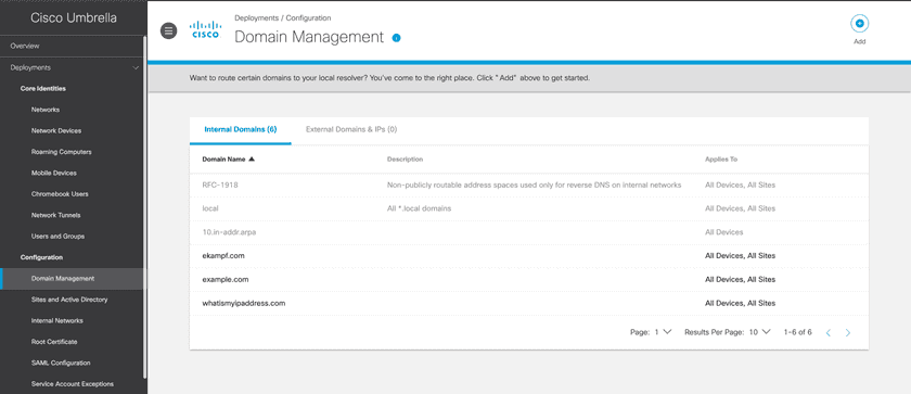 In the Cisco Umbrella Management Console, go to Deployments → Configuration → Domain Management: