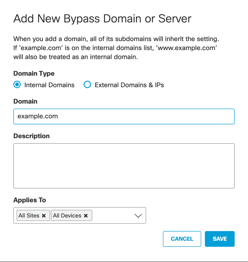 Important Note: AnyConnect does not support midfield wildcards (bla.*.example.com is not a valid Domain for Umbrella) but it does support left hand wildcards which are also implied (example.com on the list of Bypass Domains is therefore the same as *.example.com).