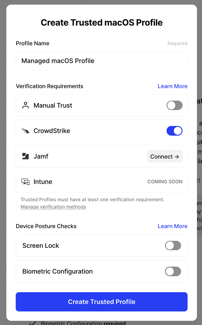 For macOS, Windows, or Linux (requires version 2024.018+), create a Trusted Profile and require CrowdStrike as a Trust Method. Only devices that have CrowdStrike configured will satisfy the requirements of this Trusted Profile.
