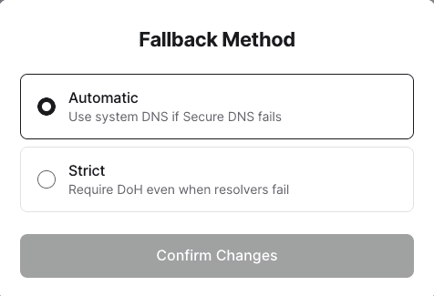 We offer a number of pre-configured public resolvers as options, and you may also use a custom DoH resolver. - Determine the resolver fallback behavior.