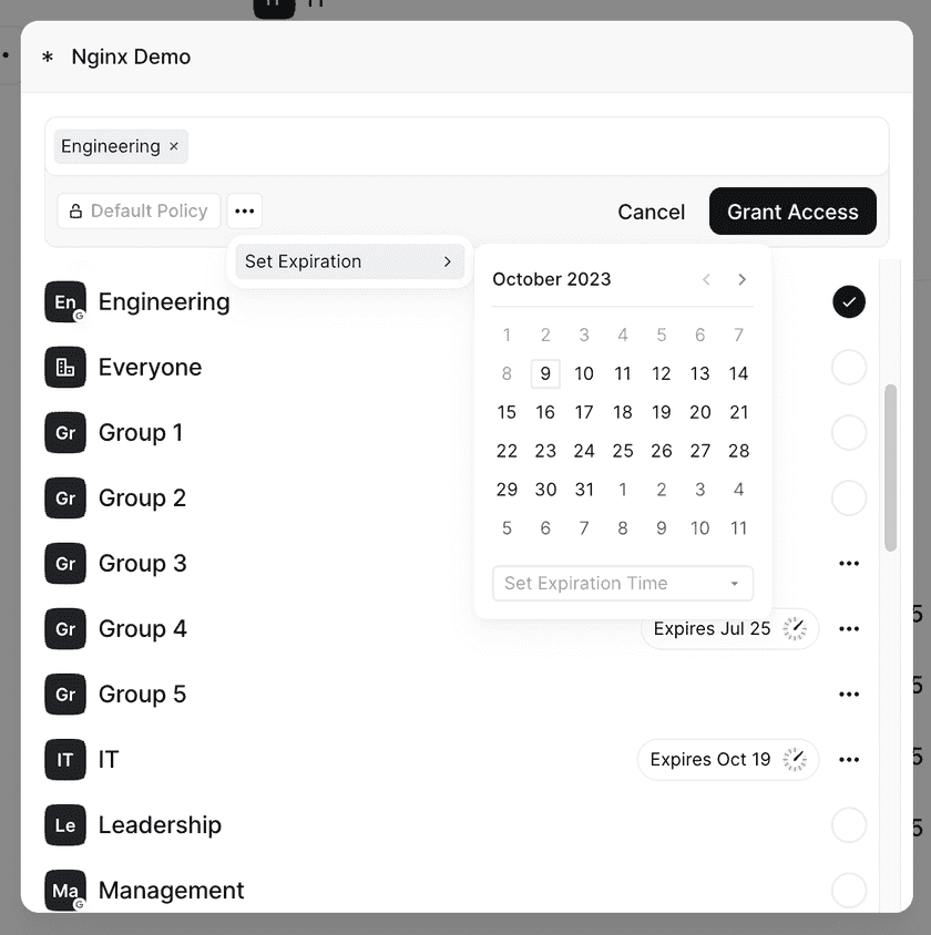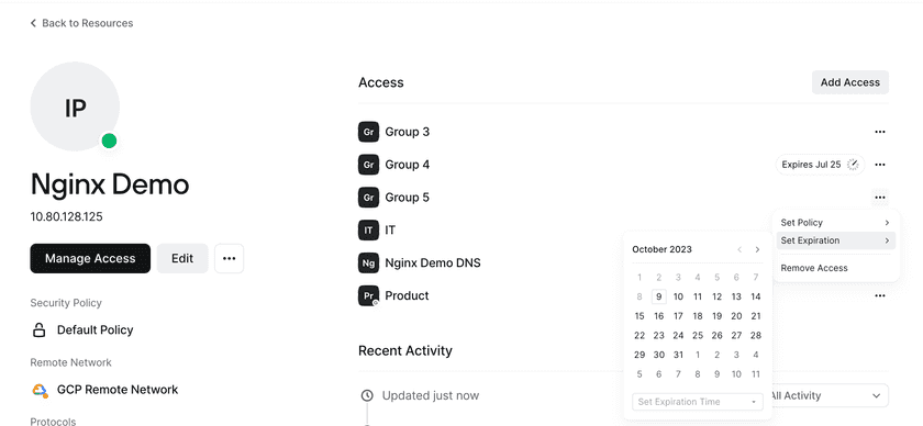 You can configure Ephemeral Access from either a Resource or Group page. The expiration time for a particular access right can be set to any time from the next hour to one year from the current date. When the expiration time has elapsed, the Group will be removed from the Resource and users in that Group will no longer have access to that Resource.