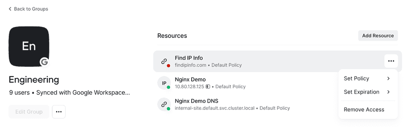 An expiration time can also be modified for a Group that already has access to a Resource by clicking on the options button and then setting the expiration time.