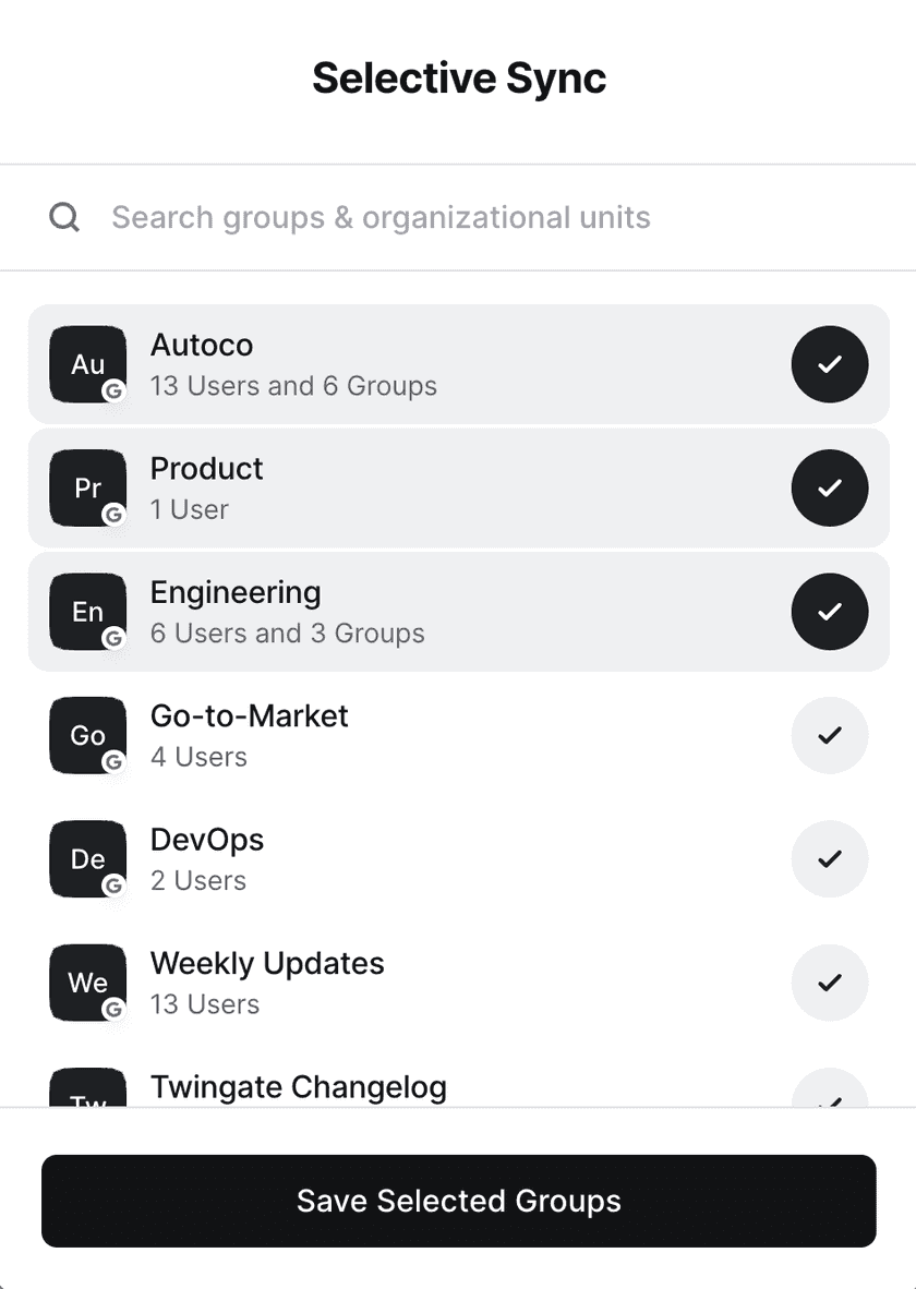 Once your selection is saved, your selection will be used when the next sync happens. Twingate will sync all selected groups, the children of selected groups, and all users in synced groups. Twingate will not sync groups and OUs that are not selected and are not children of selected groups. Likewise, users not in synced groups will not be synced.