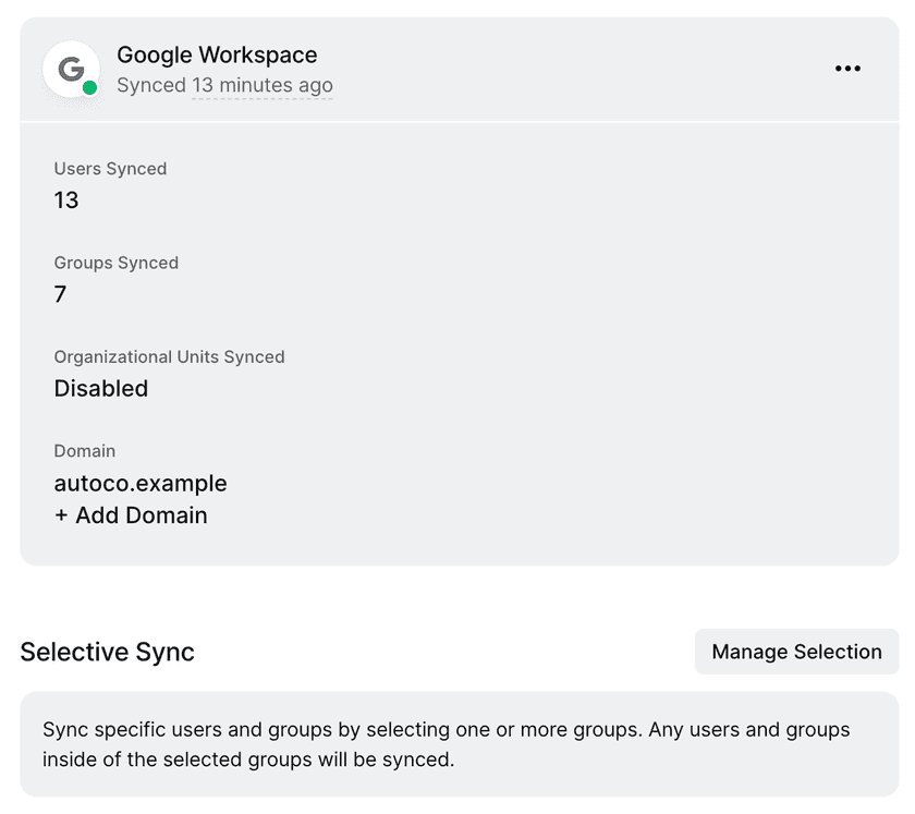 Enabling Selective Sync will limit which Google Workspace users, groups and OUs Twingate syncs. To enable Selective Sync, enable syncing groups, OUs, or both via the ⋯ action menu. Next, click on the “Manage Selection” button in the “Selective Sync” panel.