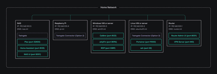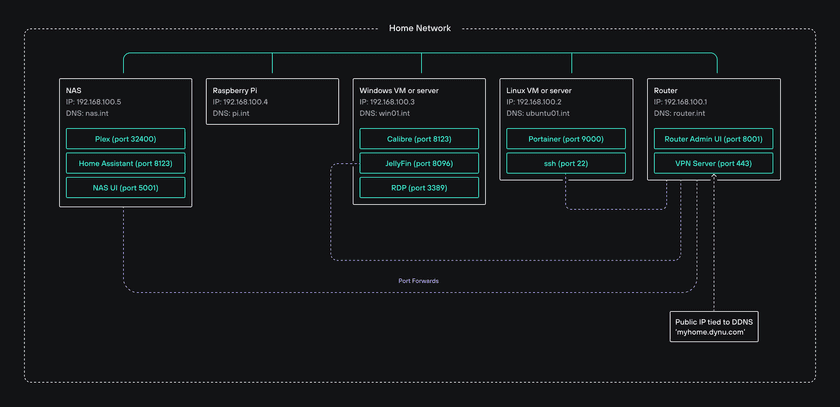 Let’s say that these machines run various services (on different ports) that are typically used in home labs (e.g. Plex, Jellyfin, Calibre, Portainer, Home Assistant, Radarr, Sonarr, etc.).