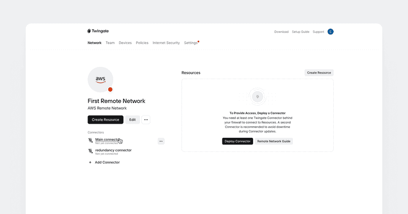 You can now connect to your Twingate environment but you cannot yet connect to any of your home’s servers or services. Twingate is designed around zero trust principles, therefore it grants no permissions by default.