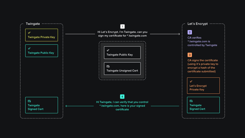 When an entity like Twingate wants to obtain a signed certificate for its domain (twingate.com), it contacts a CA (Let’s Encrypt, in our case) and makes a claim on its domain. The CA then verifies the requesting entity is who it says it is and that it has full control over the domain (different methods are used by different CAs). The CA then uses its own private key to sign the certificate (it encrypts a hash of the certificate) and sends the signed certificate back to the requesting entity.