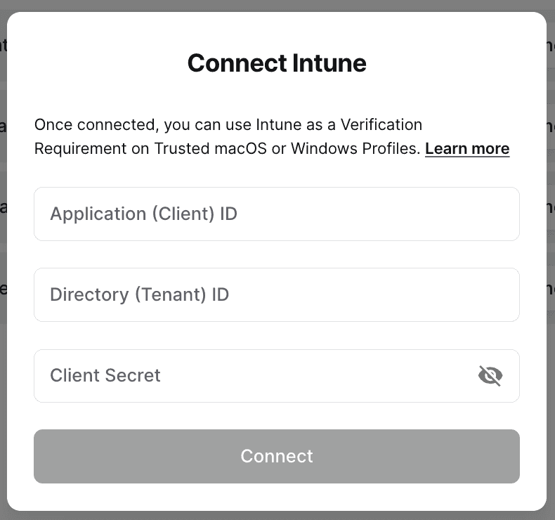 Twingate integrates with Intune so that admins can set it as a requirement to sign in to Twingate or access private Resources. When Intune is selected as a trust method within Device Security, it can be incorporated into Security Policies. Only Mac and Windows devices that are verified through the Intune integration will be considered satisfying the Trusted Profile and be allowed to access private Resources.
