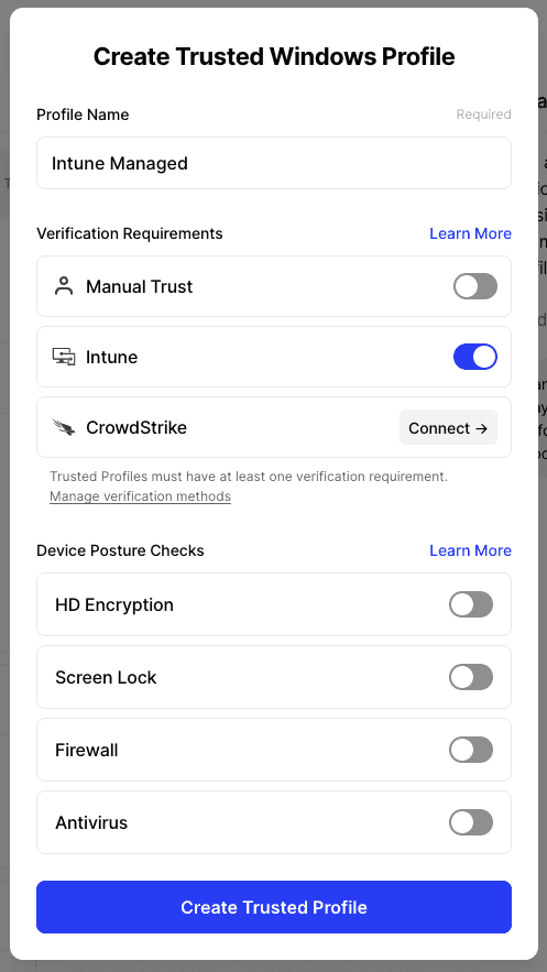 After the Intune integration has been set up, it can be configured into Device Security Trusted Profiles.