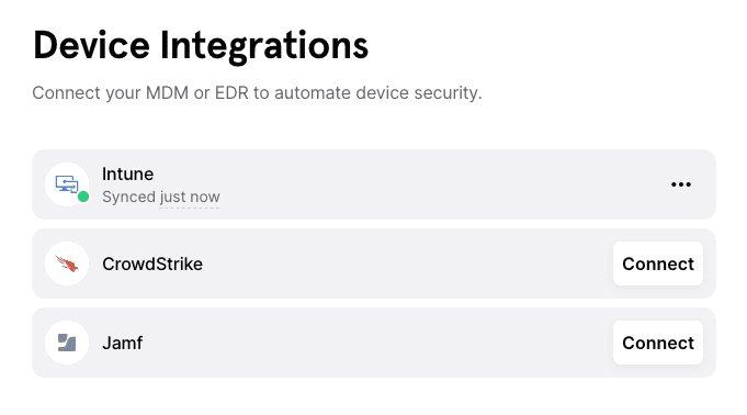 After the Intune integration is set up, the Device Settings page will show the status as “Waiting to sync”. During this time, devices may be missing the correct Intune verification state. After a few minutes, the Device Integration page will show the most recent sync time and devices will correctly show their state on their device details page.
