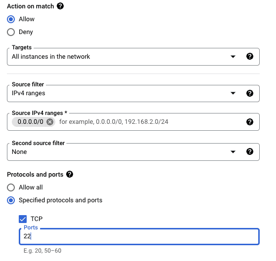 This rule will expose port 22 to the internet, if you would like to restrict this further please see this official guide.