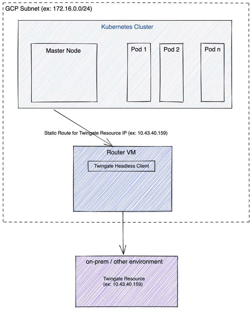 The general idea is to use the Twingate Headless Client in a dedicated Virtual Machine that acts as a Router from the perspective of the GKE Cluster: