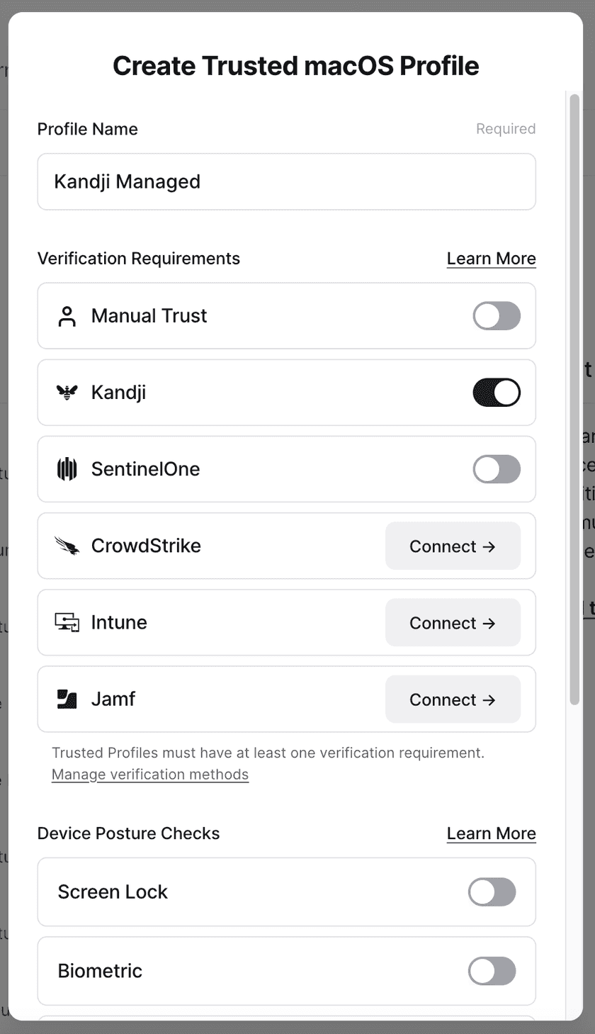 For macOS, create a Trusted Profile and require Kandji as a Trust Method. Only devices considered Kandji-verified will satisfy the requirements of this Trusted Profile. This Trusted Profile can now be incorporated into Security Policies.