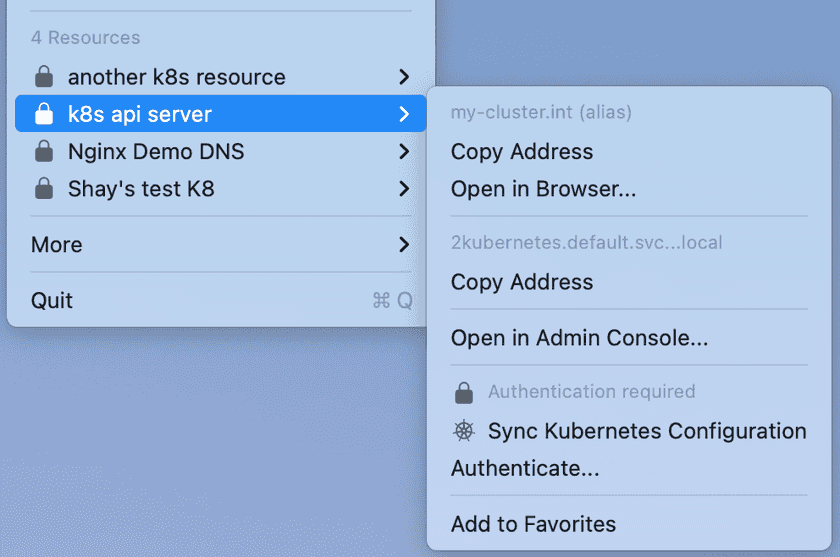 After a user is given access to a Kubernetes Cluster Resource, they will need to sync the Kubernetes configuration file on their machine. This will set up the kubeconfig file on the machine, enabling access. Users can choose to sync a specific Resource, sync all Resources, or set up an auto-sync to keep the configuration updated.
