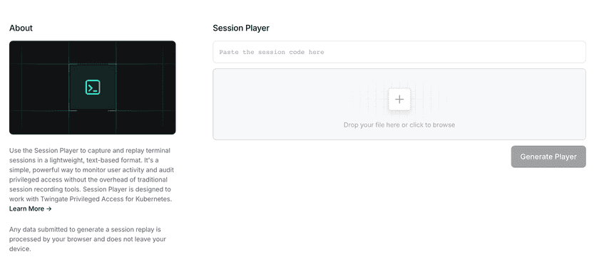 The logs are in asciicast v2 format and can be replayed via a standalone Twingate asciicast web player (https://www.twingate.com/sessionplayer). You can either copy and paste the log or upload a file to replay the session.