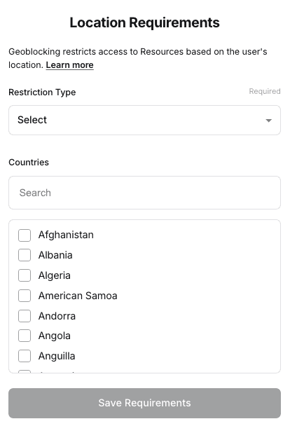 - Based on the selected restriction type, select countries that should be allowed or denied access to Resources.