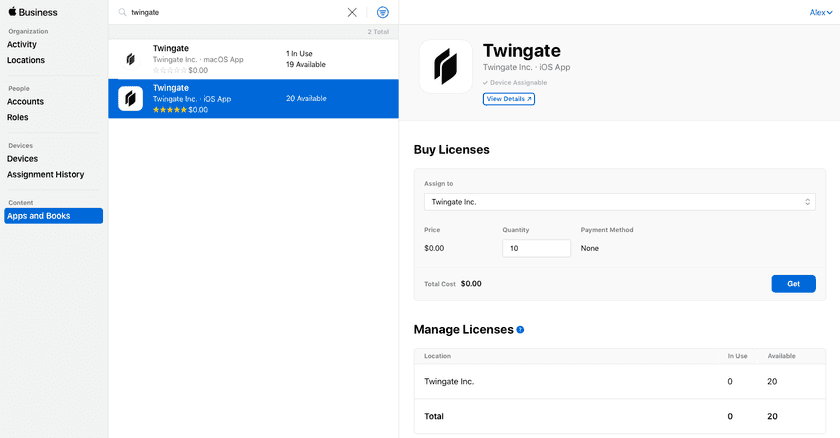 Twingate is a free app available on the Mac App Store and App Store, however in order to distribute it via an MDM solution, you must “purchase” seats for the Twingate app before they can be distributed via your company’s MDM solution. You’ll need to go through the following steps: