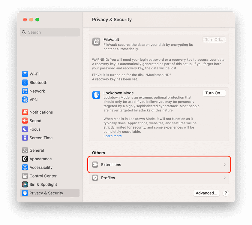 Afterwards, the status of the system extension can be found at the bottom of the Privacy & Security page under “Extensions”.