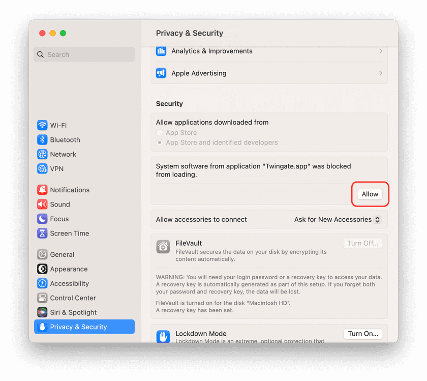 In System Settings, navigate to the “Privacy & Security” section in the sidebar. Scroll down to the “Security” section and look for a panel that says “System software from application ‘Twingate.app’ was blocked from loading.” Click on “Allow” to enable the system extension.