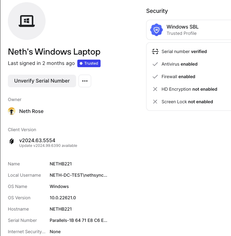 | Serial number | The hardware serial number of the device. | Windows, macOS, Linux |