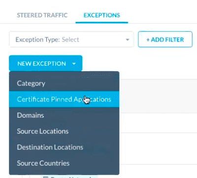 Select “Certificate Pinned Application” as the exception type:
