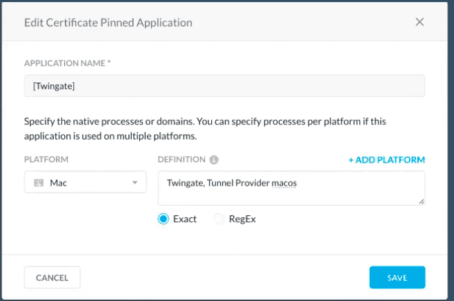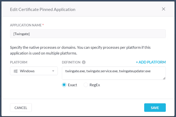 Add entries for all applicable platform types and in the definition field, specify the names of Twingate Client processes.