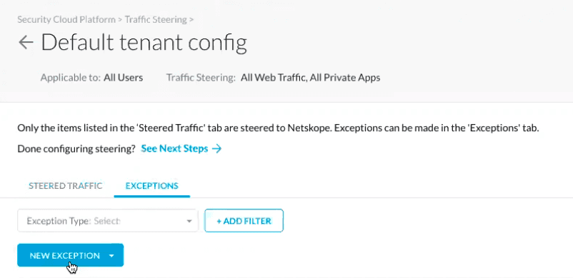 Go back to Settings and then Steering Configuration. Create a new one if you do not have any. Otherwise, open up your existing configuration. Under the “Exceptions” tab, create a new exception: