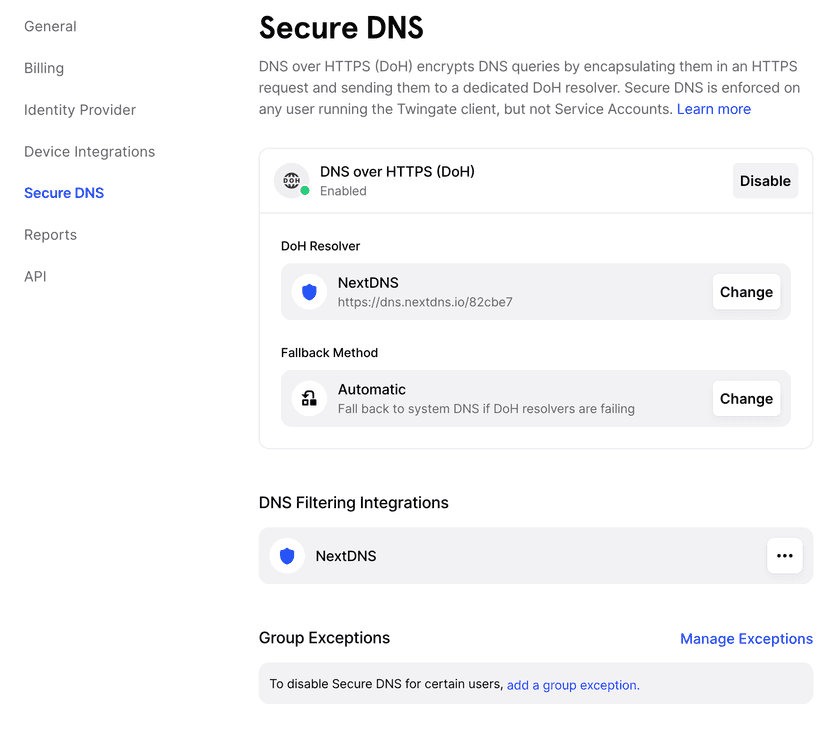 Billing for NextDNS is separate from your Twingate account at this time and is managed directly in your NextDNS account page. View NextDNS pricing for more information.
