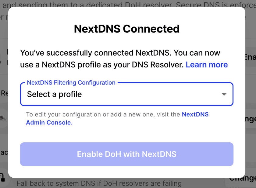 4. Select which NextDNS profile to use as the DoH Resolver. Confirm the settings.