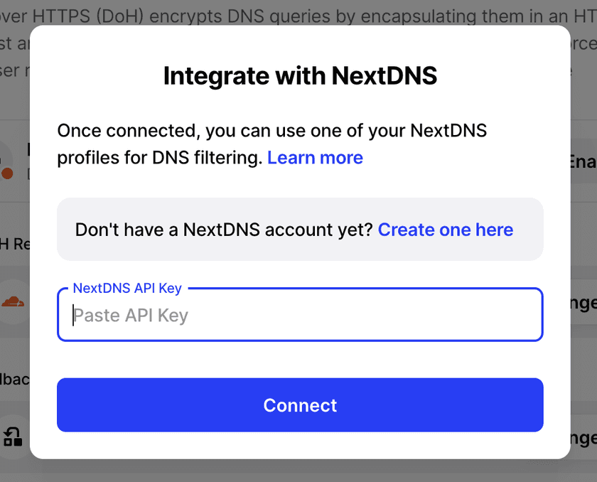 3. Input the NextDNS API key (found on the NextDNS account page) or create a NextDNS account if none exists.