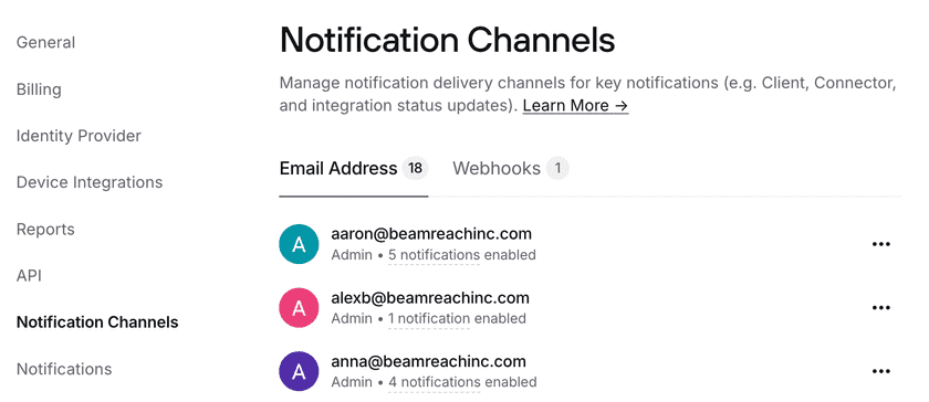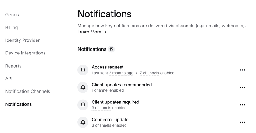 For other important notifications, admins can customize both the recipients and the delivery method. These notifications can be sent to specific email addresses or to a webhook, allowing for integration with your existing workflows. For details on the notifications and their payloads, see below.