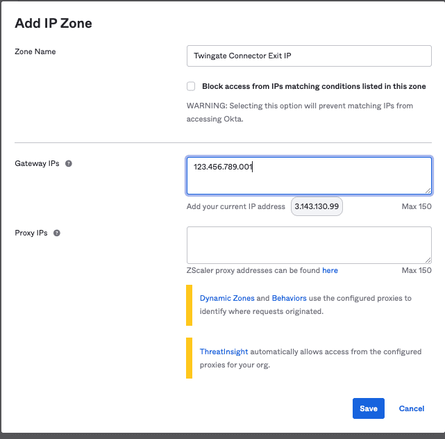 Choose a Zone Name that you’ll easily identify with this use case (e.g., Twingate Connector Exit IP). Insert the public IP address used by the relevant Twingate Connector(s) in the Gateway IPs section.