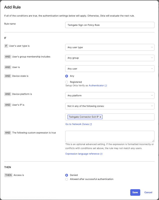 THEN Access isto Denied to effectively deny access if the user is not originating from the Connector IP that we previously specified. - Hit Save when you are ready to confirm rule creation.