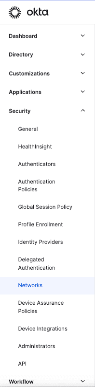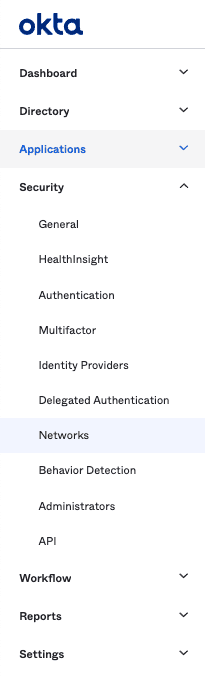 From the Okta Admin Console, navigate to Security > Networks: