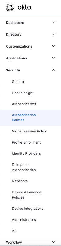 From the Okta admin console, navigate to Security > Authentication Policies: