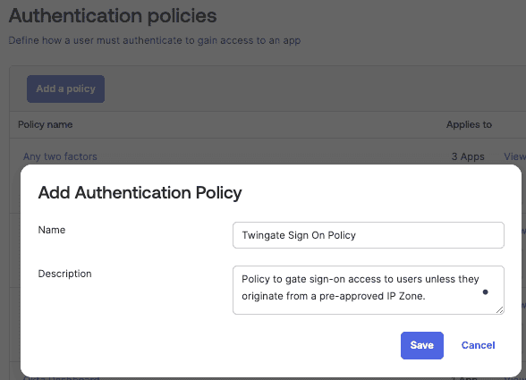 From the Authentication policies section of the Okta admin console, select Add a policy, specify a name and description, and then click Save.