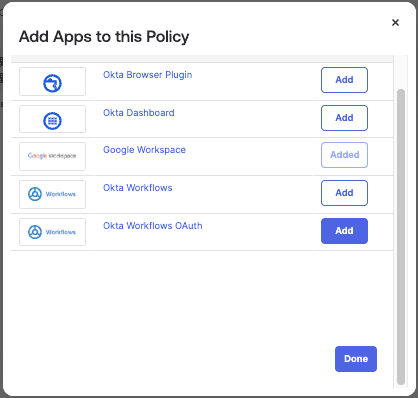 For this example, we will be adding Google Workspace as our App. We will select Add next to its listing and click Done.