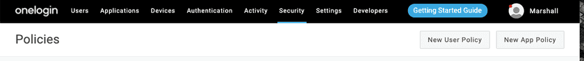 In the OneLogin admin console, navigate to Security → Policies and select New App Policy.