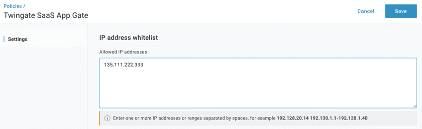 At the App Policy configuration screen, name your App Policy (in this case, we’ve named it Twingate SaaS App Gate). You’ll also see a box to the right titled Allowed IP Addresses. In that field, you’ll insert the public exit IP address for the Remote network where your Connectors are deployed.