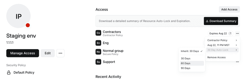 Usage-based access can also be configured at the Resource level or for a specific Group’s access to that Resource. With this, you can set a period of time after which a user’s access will be locked if they don’t access the Resource. Usage-based auto-lock is applied individually per user, helping you to ensure that only users who have a current need to access a Resource maintain that access. See Usage-based Auto-lock for more information.